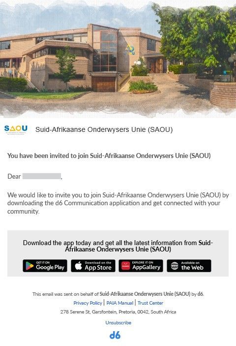 Our app is hosted by the d6 Communicator and you will be onboarded within the next few weeks. Once your details have been loaded onto the system, you will receive an email invitation from noreply@d6.co.za with a link to download the SAOU app.